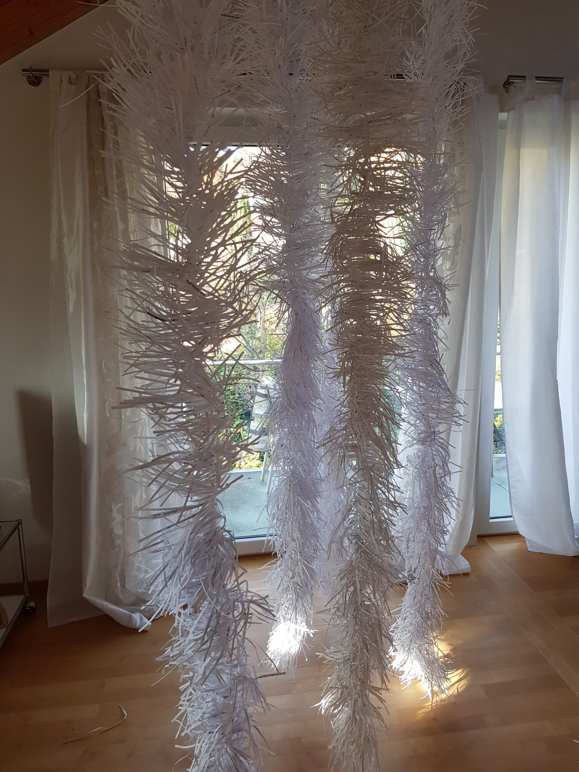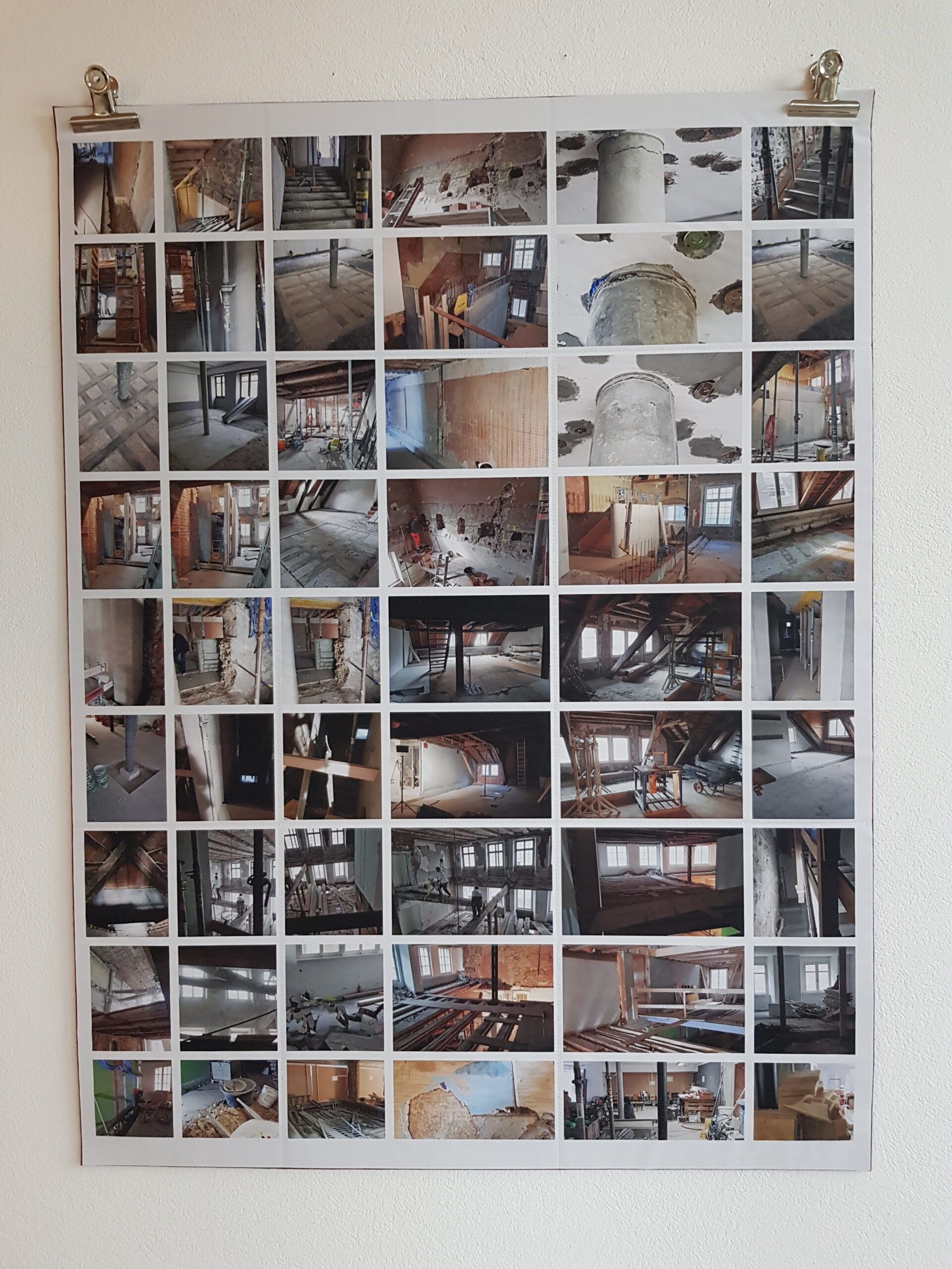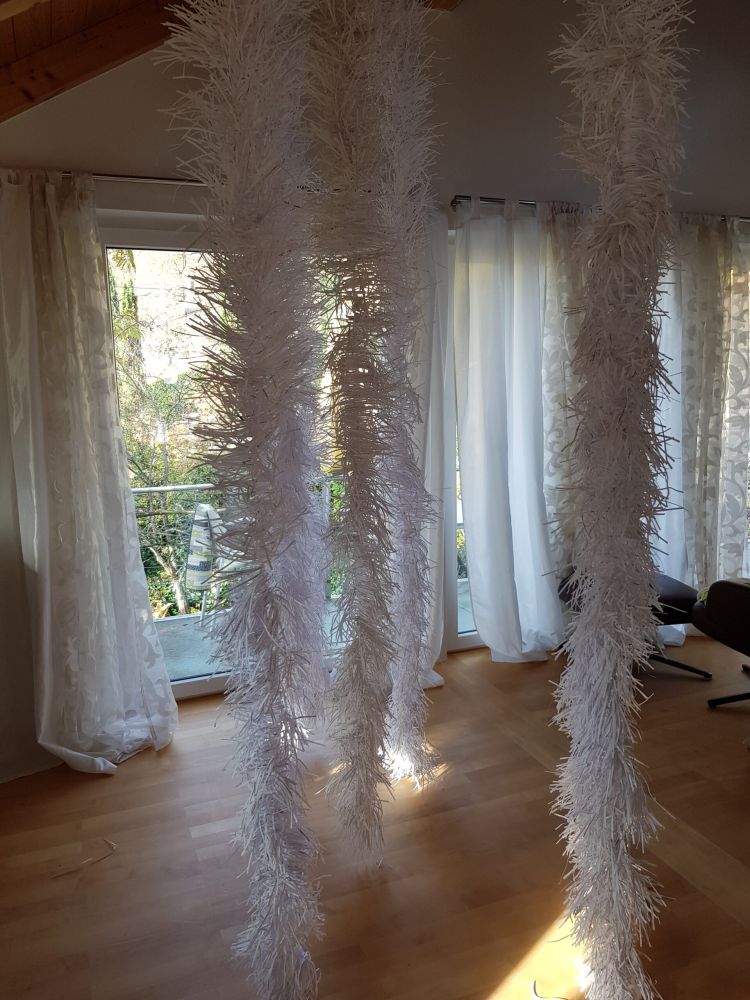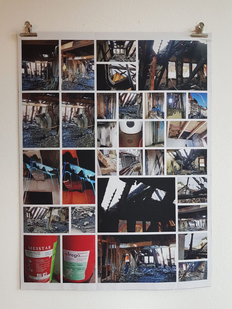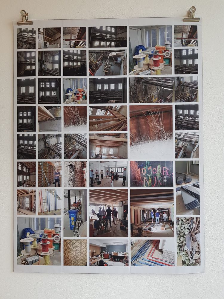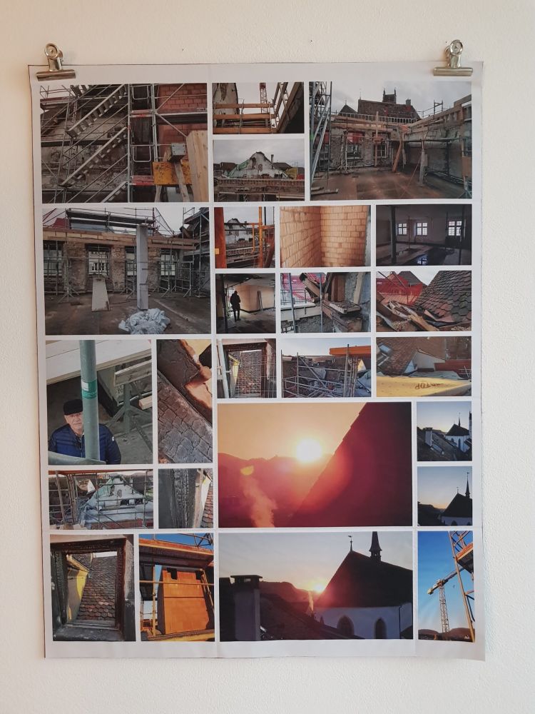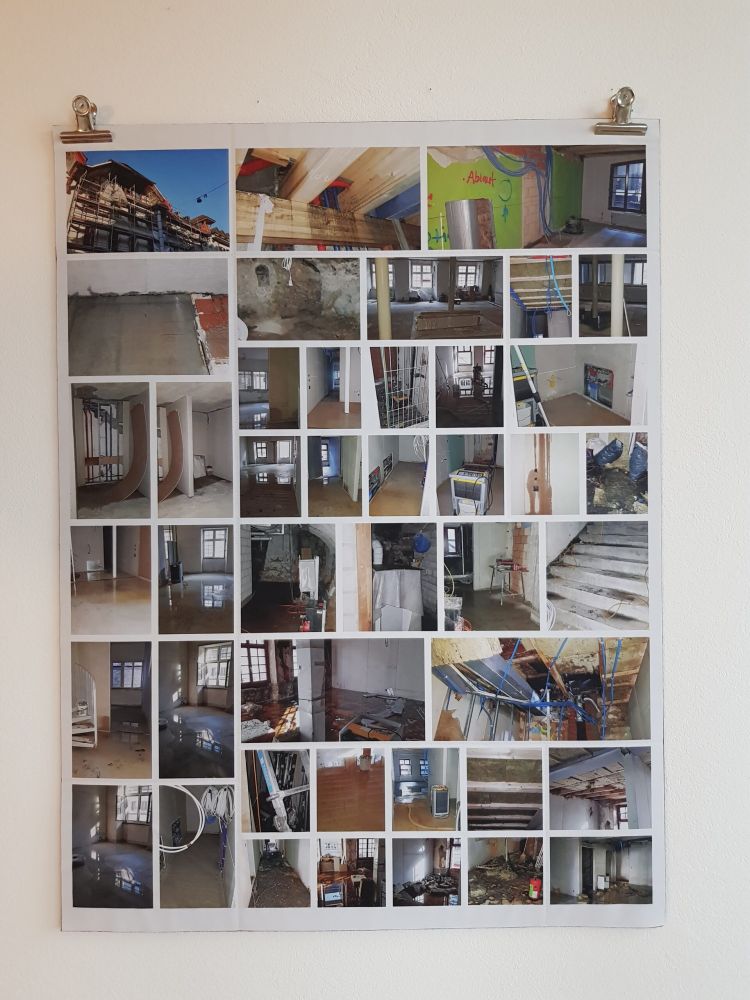 Installationen, Papierarbeiten, Textilbilder und eine Fotodokumentation des Umbaus.