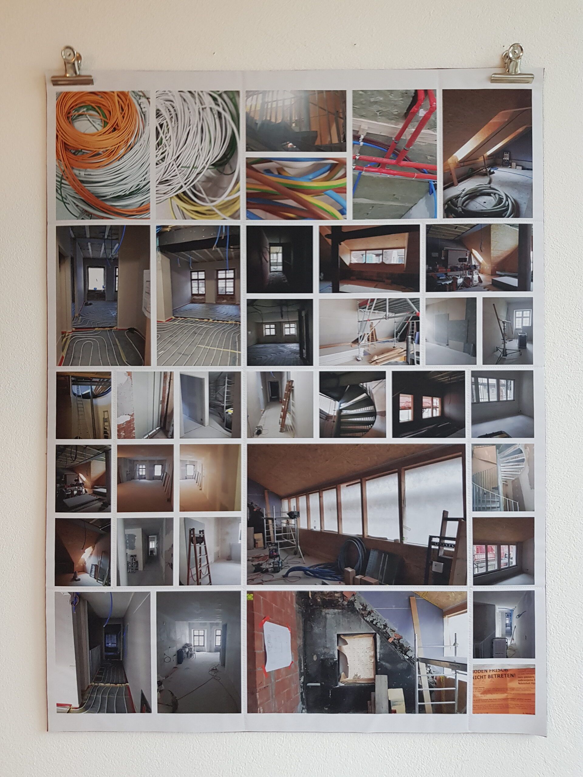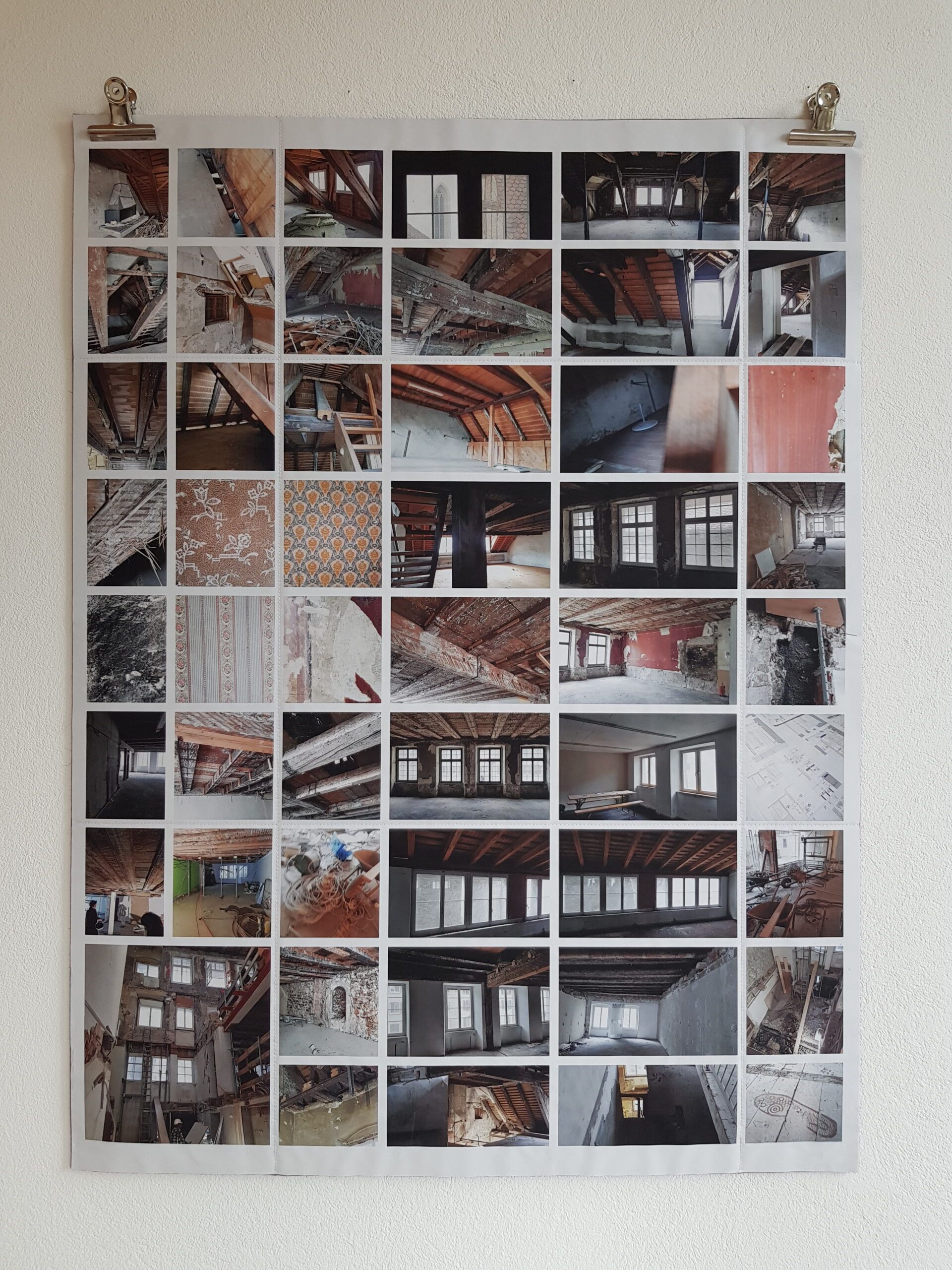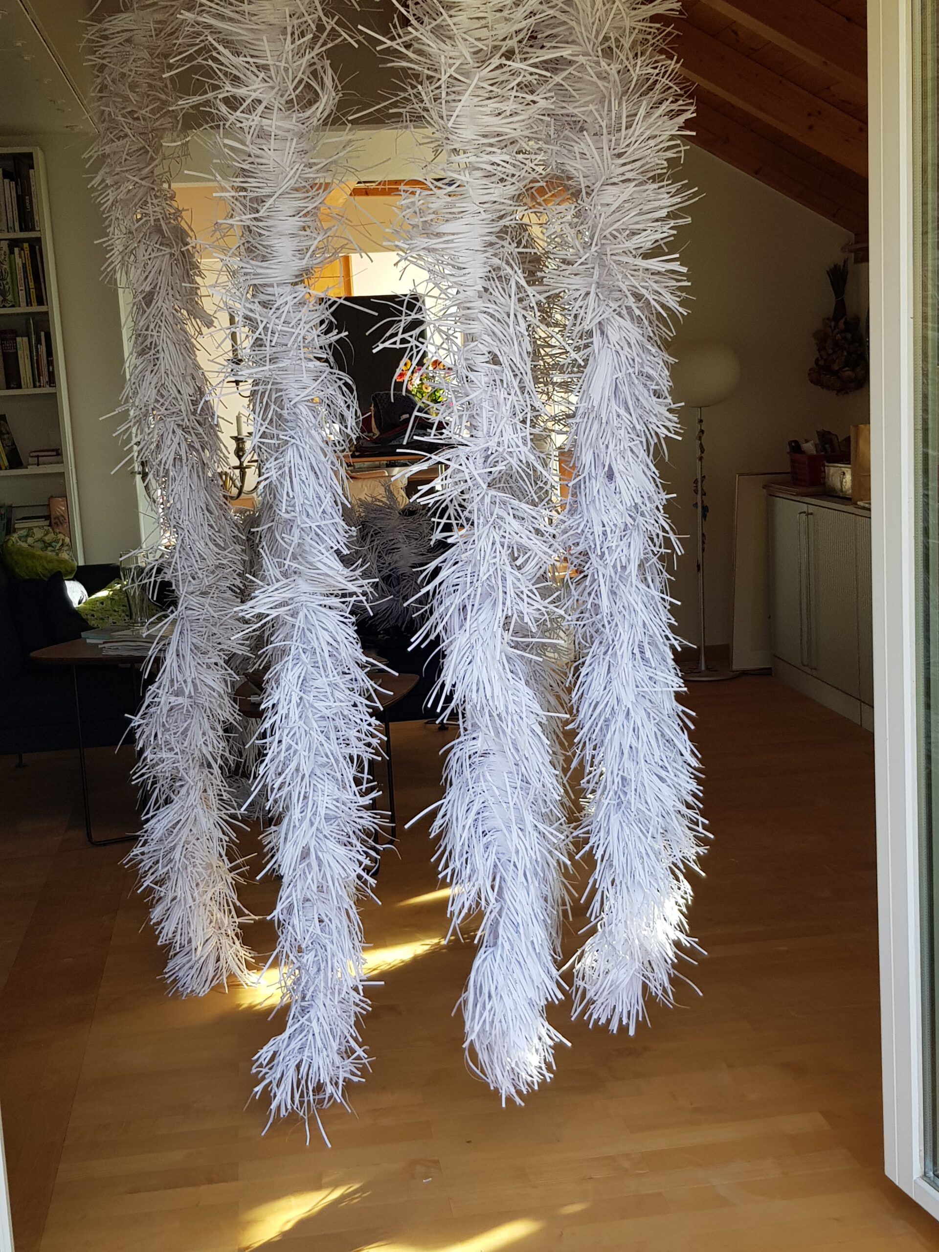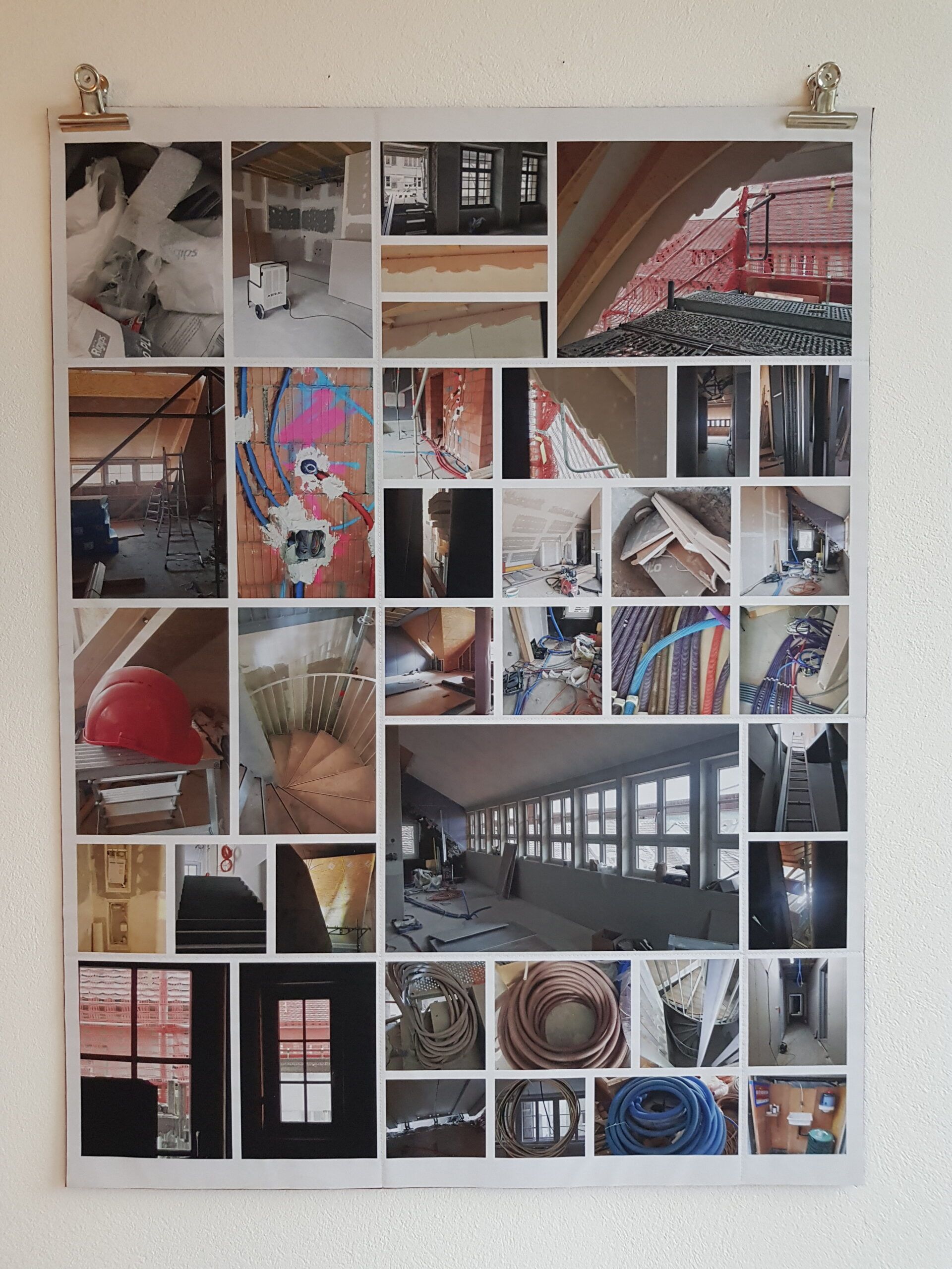 Installationen, Papierarbeiten, Textilbilder und eine Fotodokumentation des Umbaus.