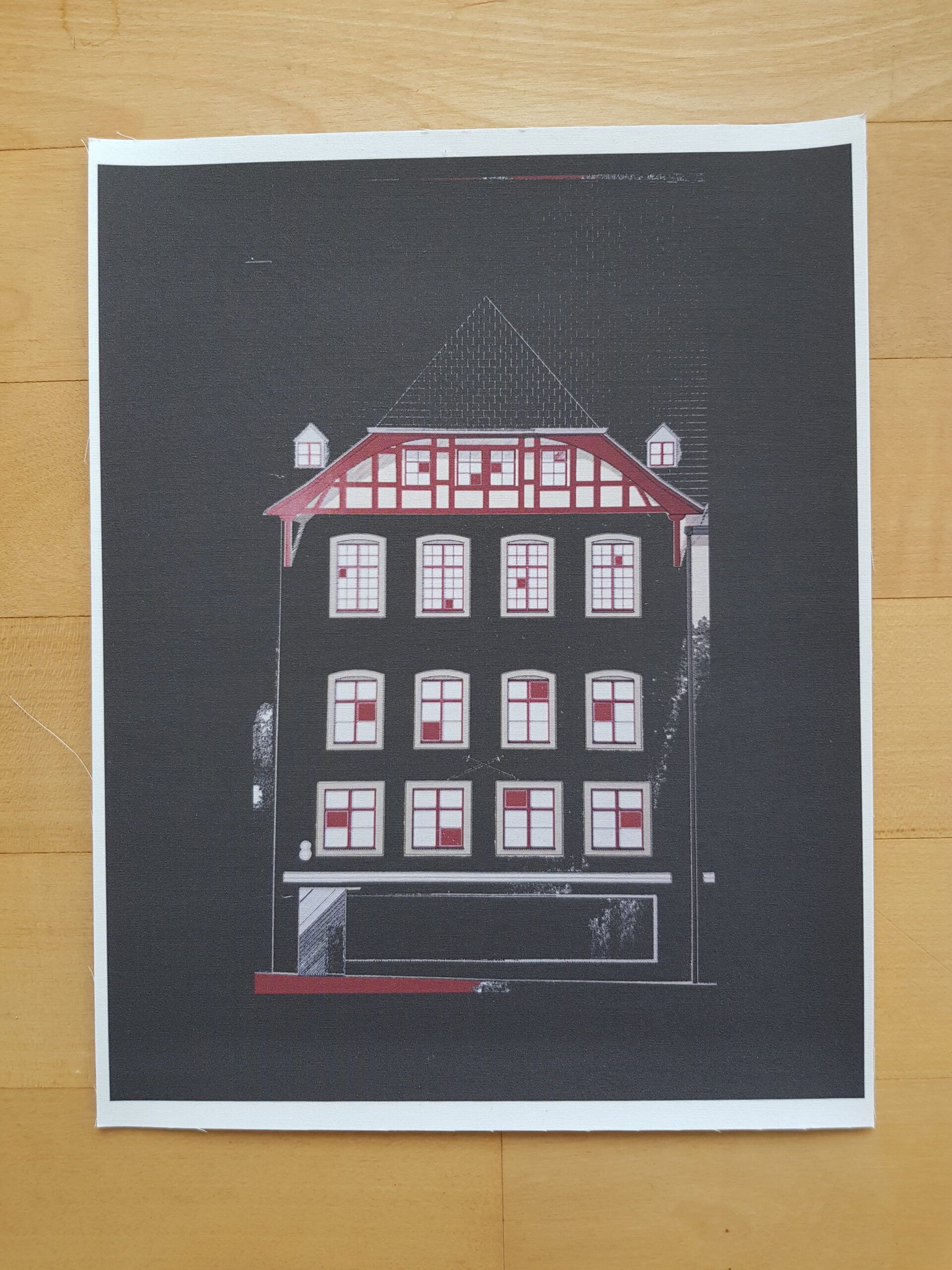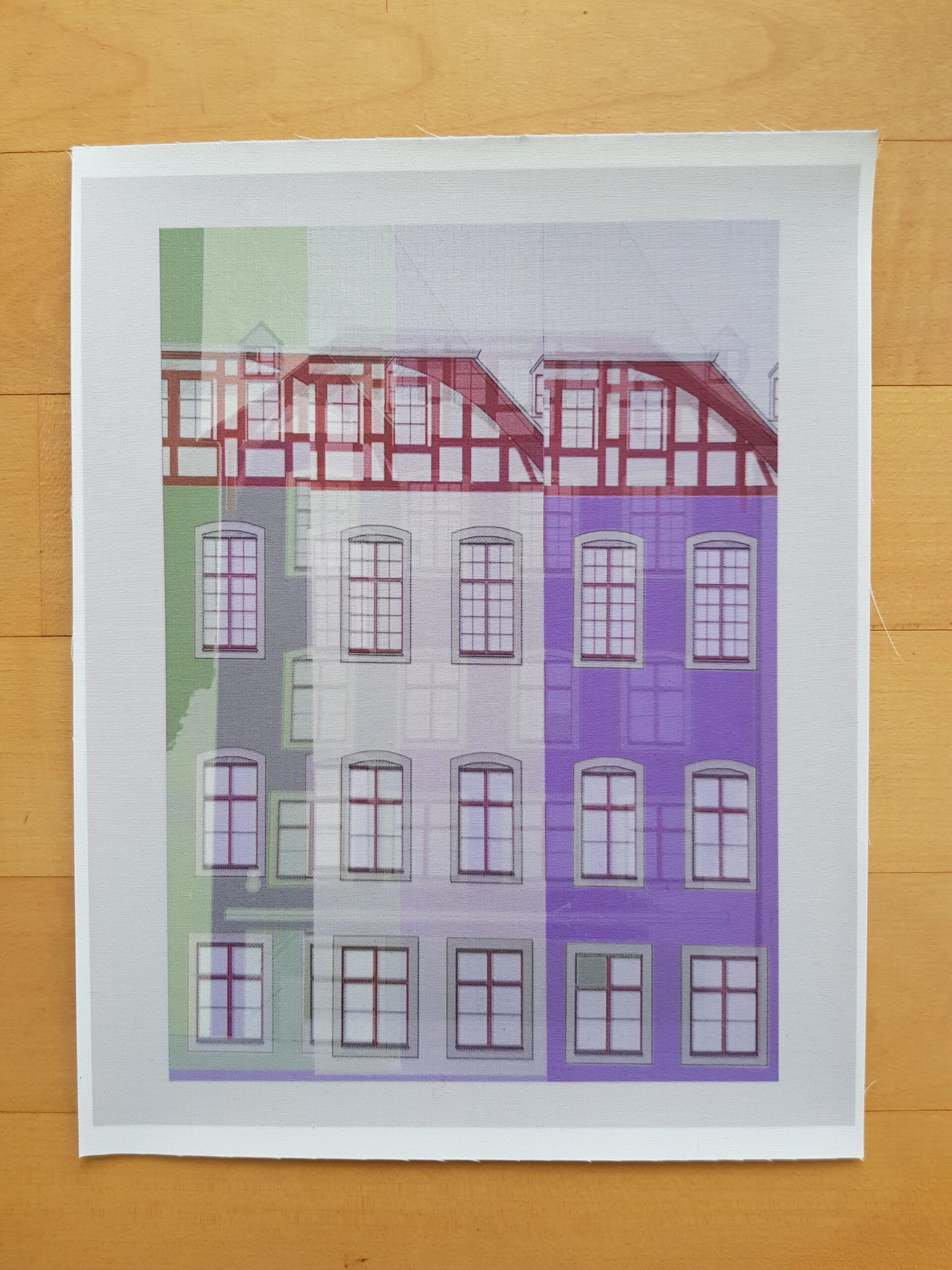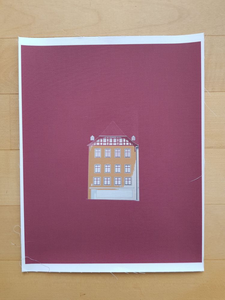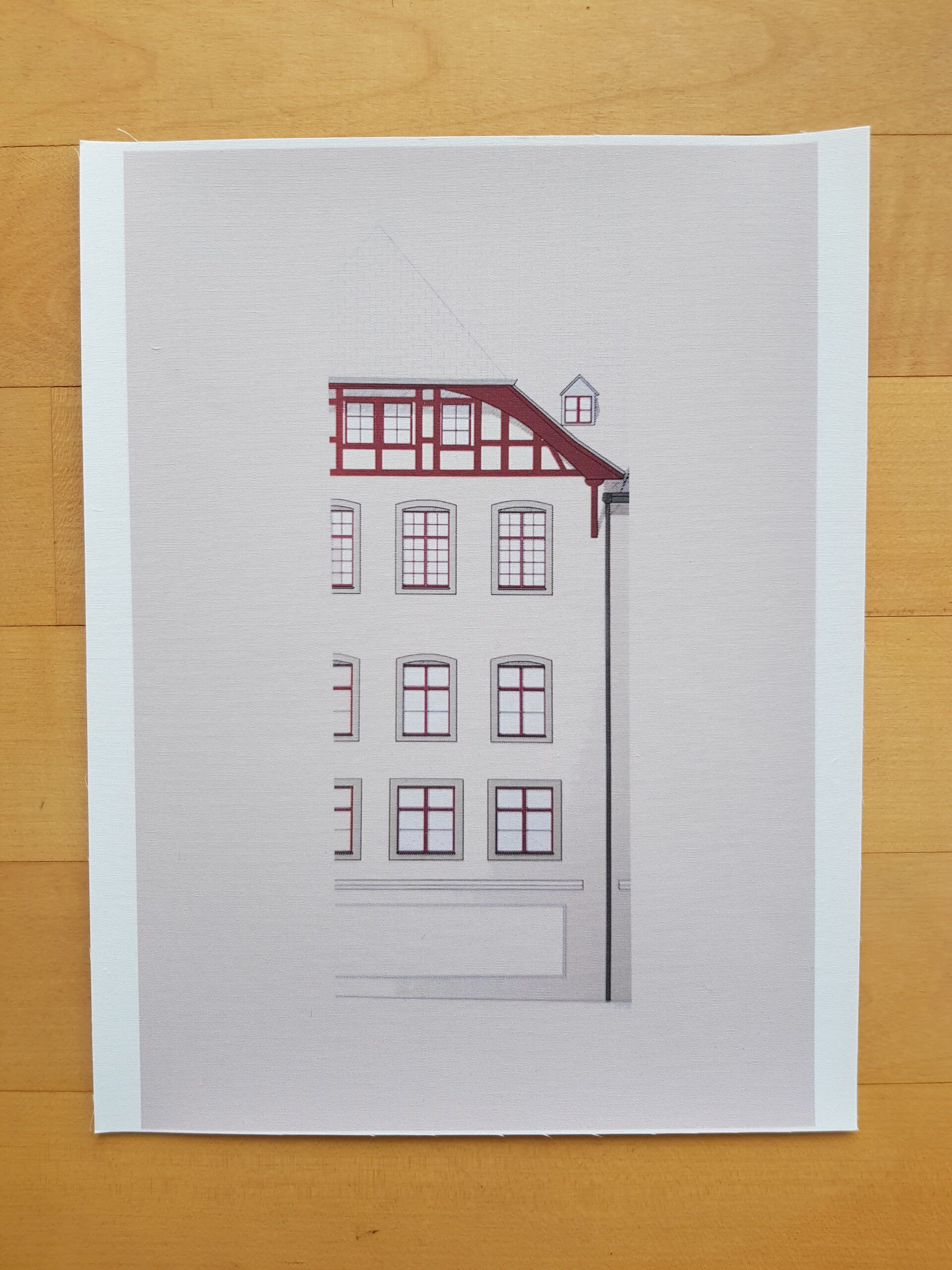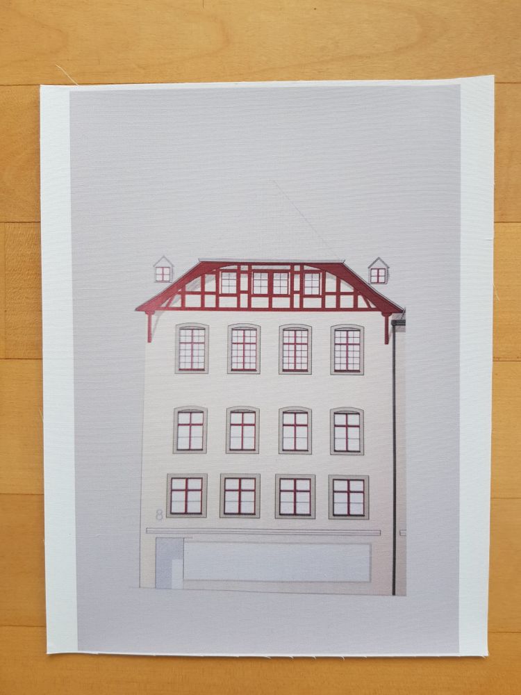 Die Planvorlagen (Ansicht Häuser) habe ich fotografiert und am Computer verändert. So sind aus einem Haus mehrere verschiedene Häuser entstanden. Eine Altstadt. Sie sind auf Stoff gedruckt und werden noch bestickt.