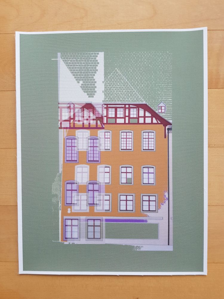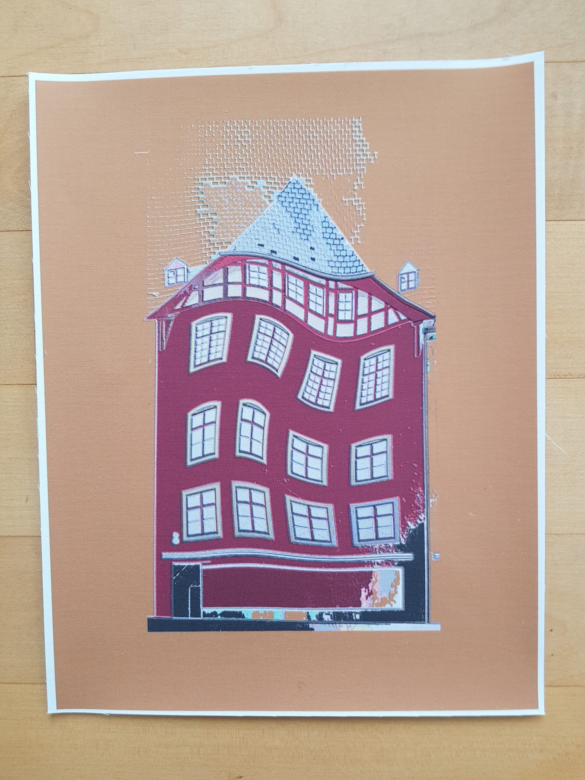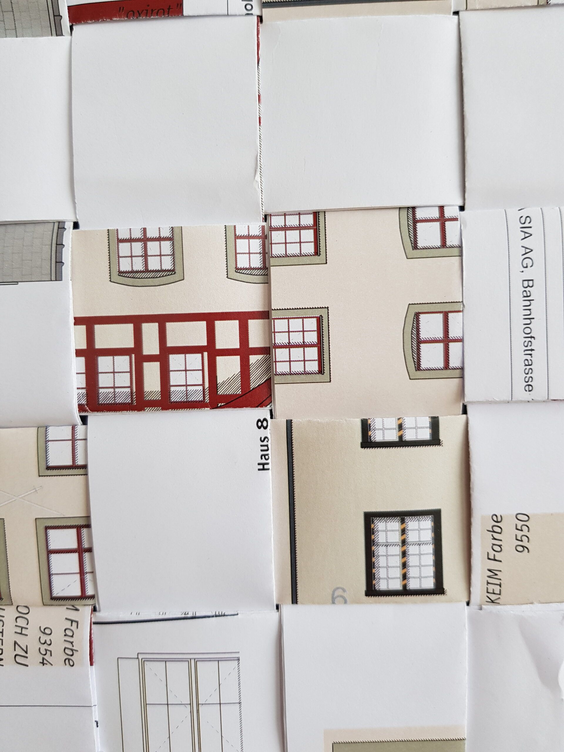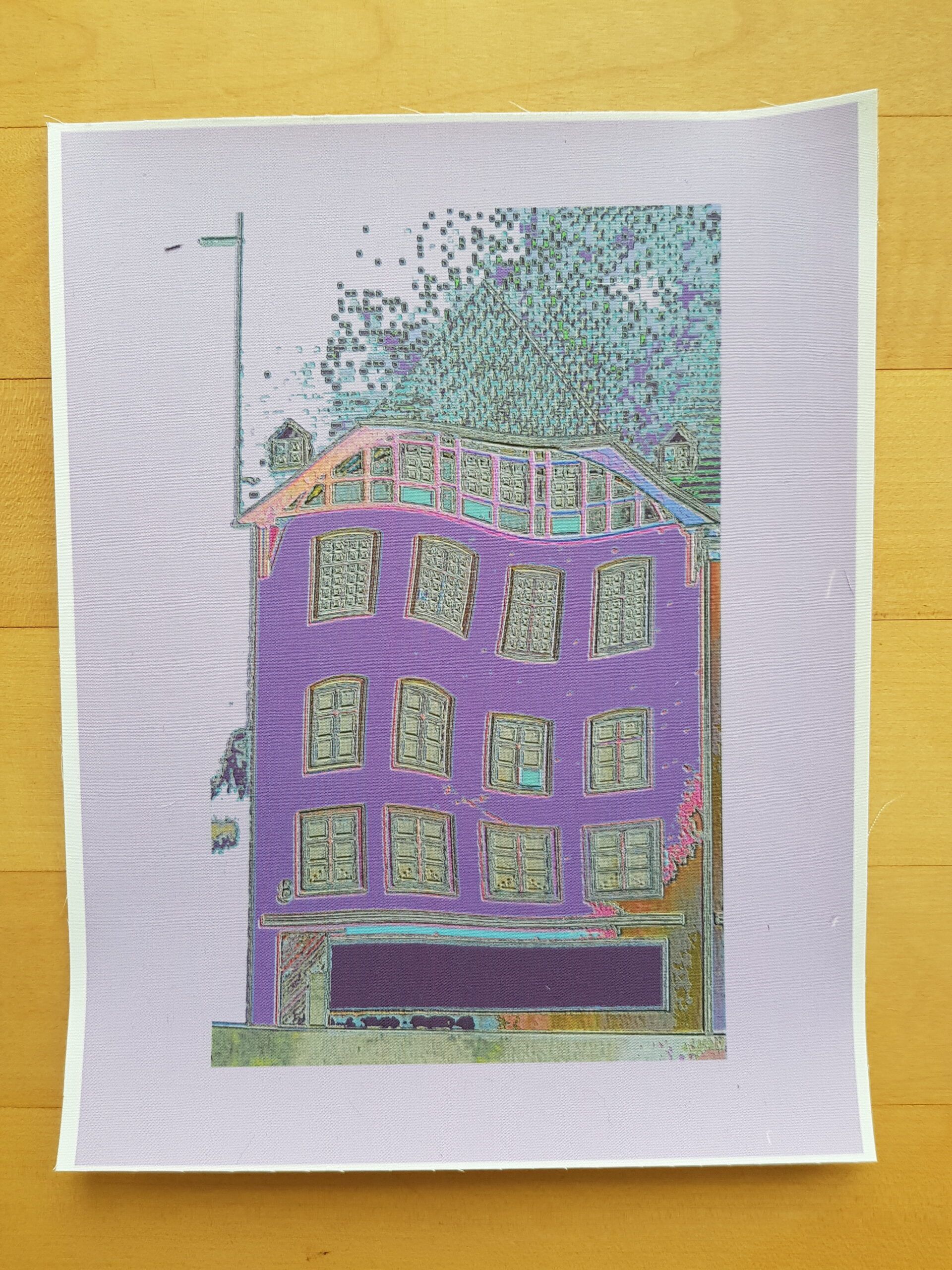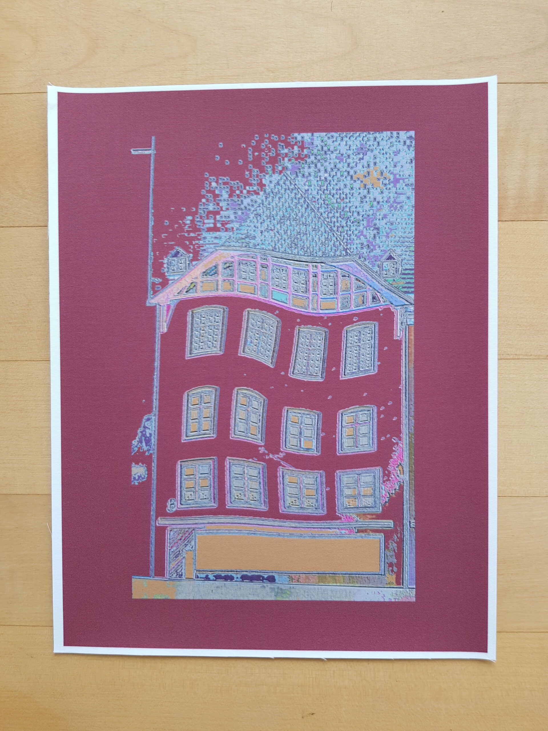 Die Planvorlagen (Ansicht Häuser) habe ich fotografiert und am Computer verändert. So sind aus einem Haus mehrere verschiedene Häuser entstanden. Eine Altstadt. Sie sind auf Stoff gedruckt und werden noch bestickt.