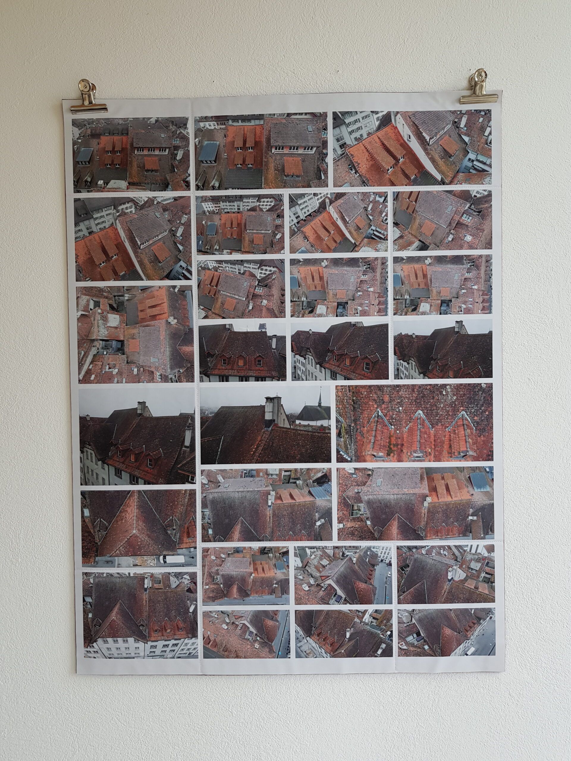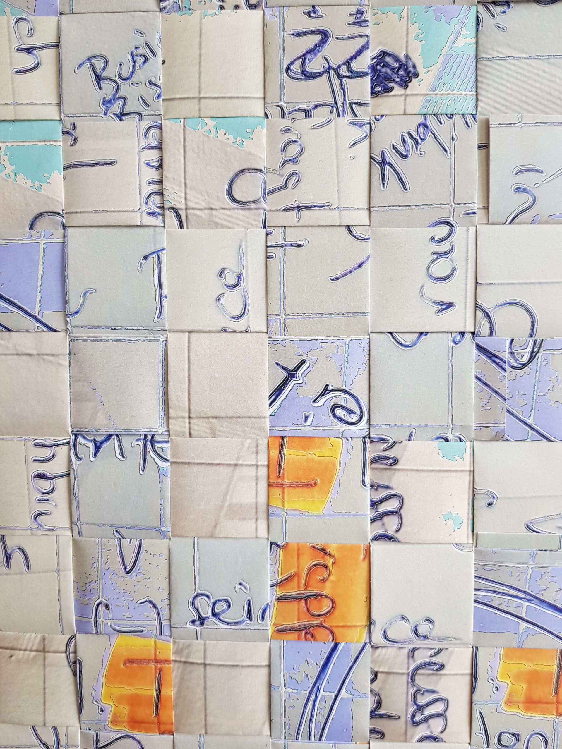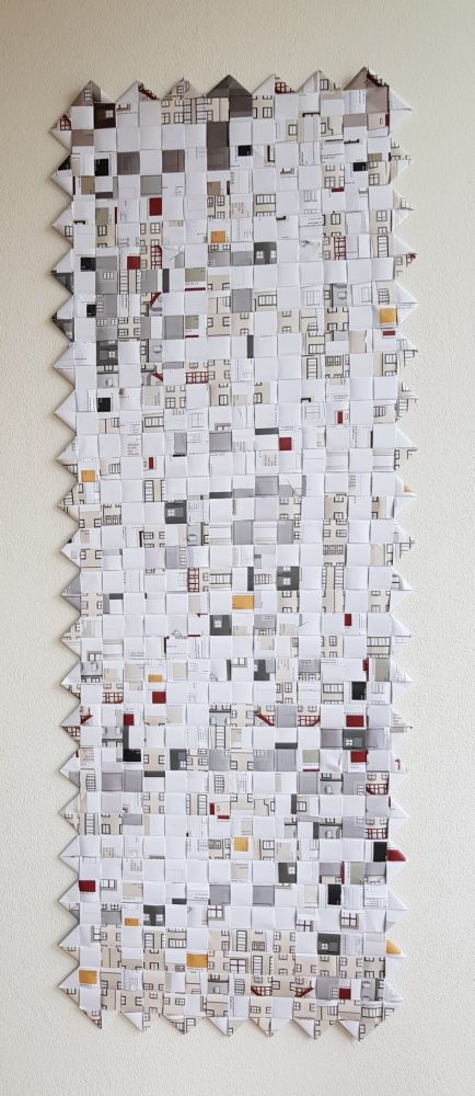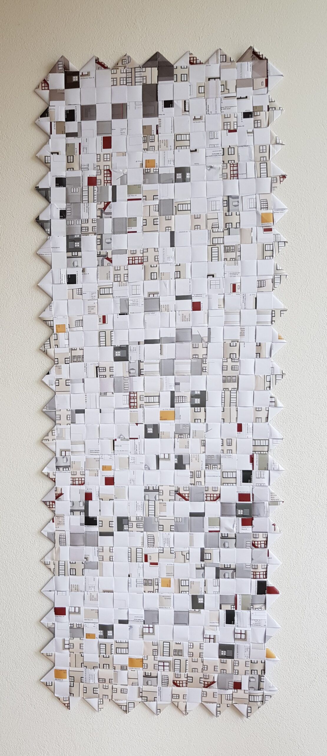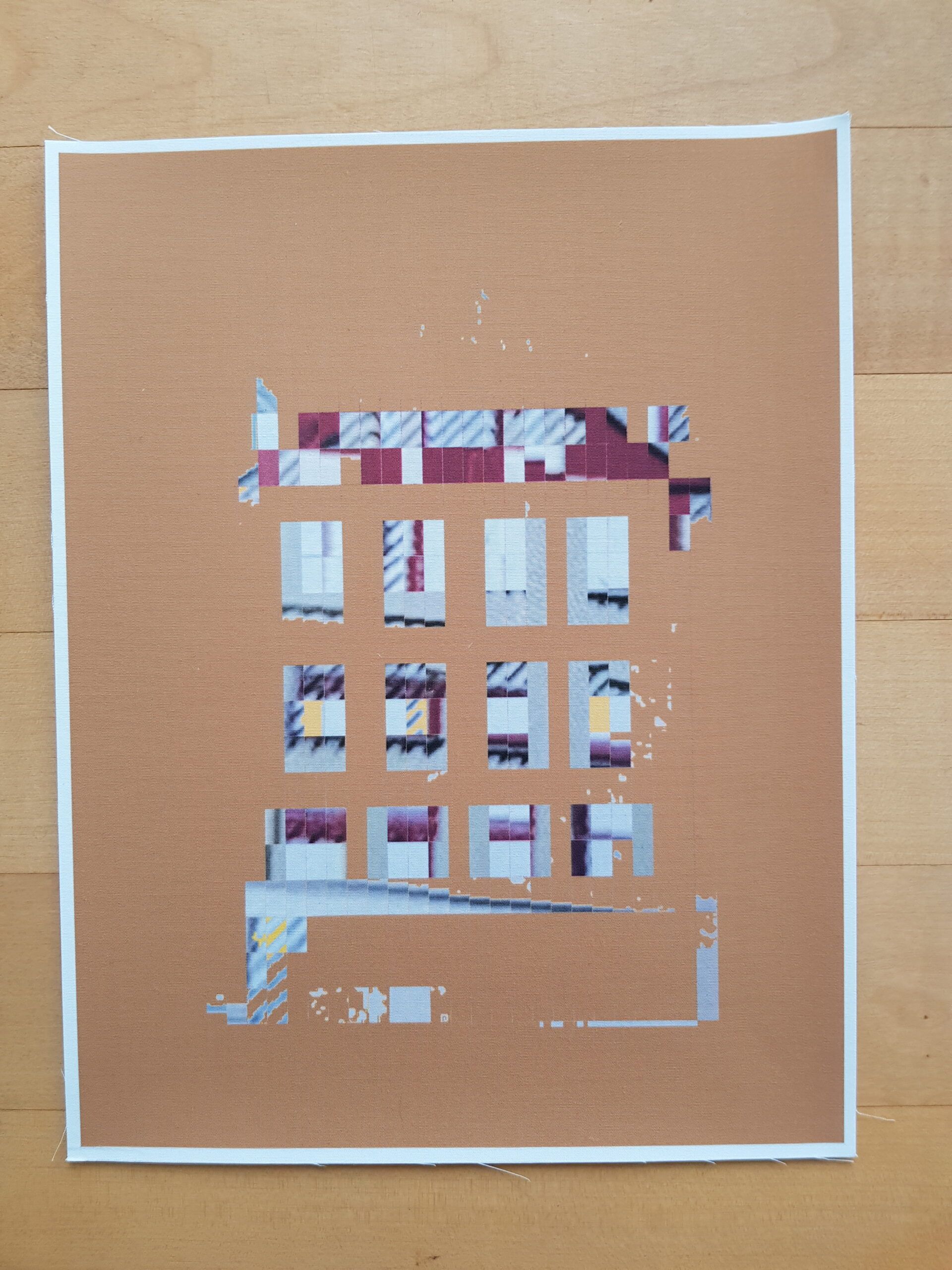 Die Planvorlagen (Ansicht Häuser) habe ich fotografiert und am Computer verändert. So sind aus einem Haus mehrere verschiedene Häuser entstanden. Eine Altstadt. Sie sind auf Stoff gedruckt und werden noch bestickt.